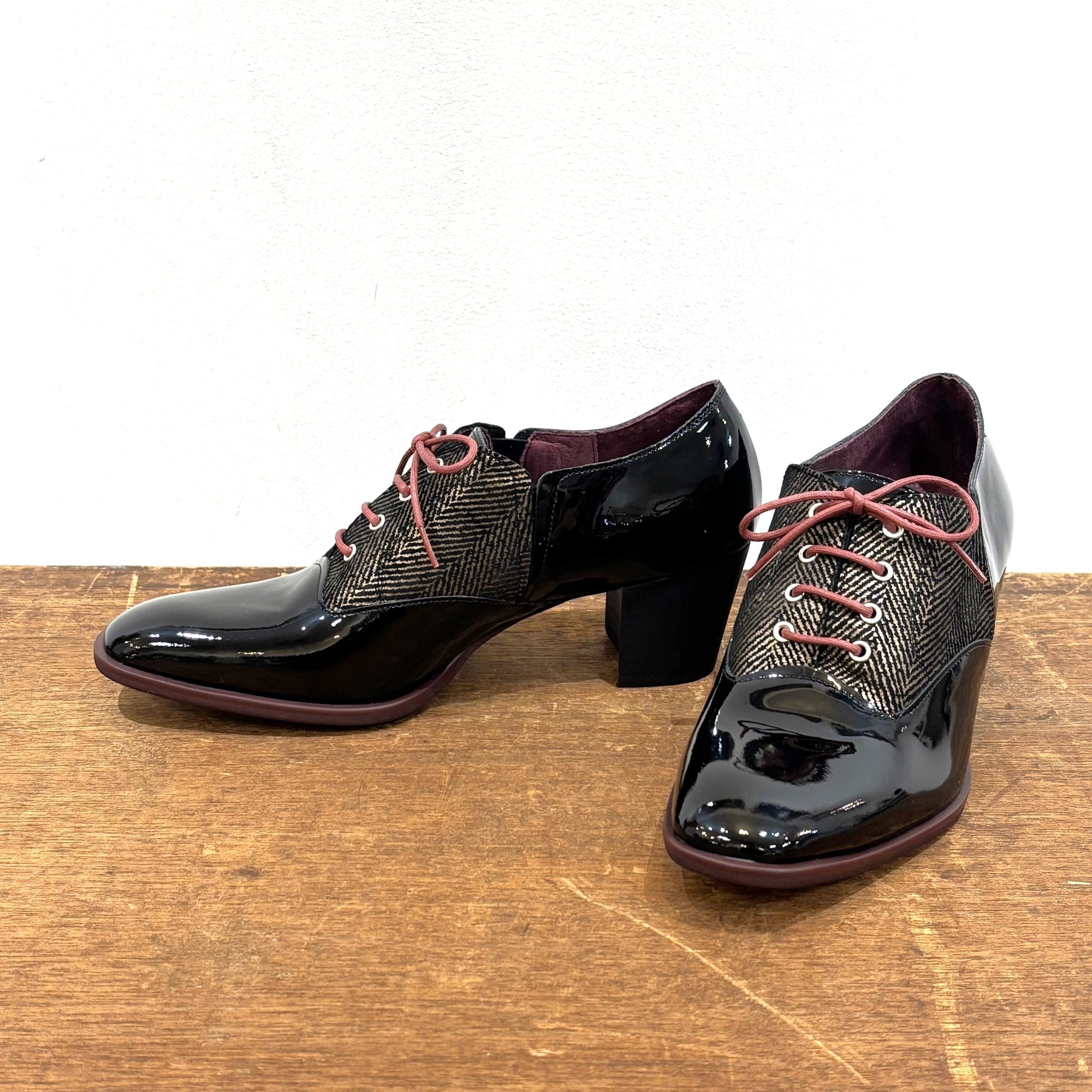 スッキリしたシャープなスクエアトゥのマニッシュシューズ。足首を綺麗にみせるサイドカーブのカットラインにこだわってます。また履き口の内外の両側にスリットゴムが入っているので、紐を解かずそのままスリッポン感覚でお履き頂けます♪