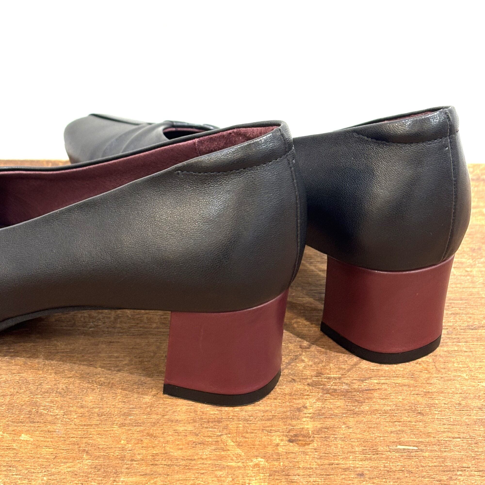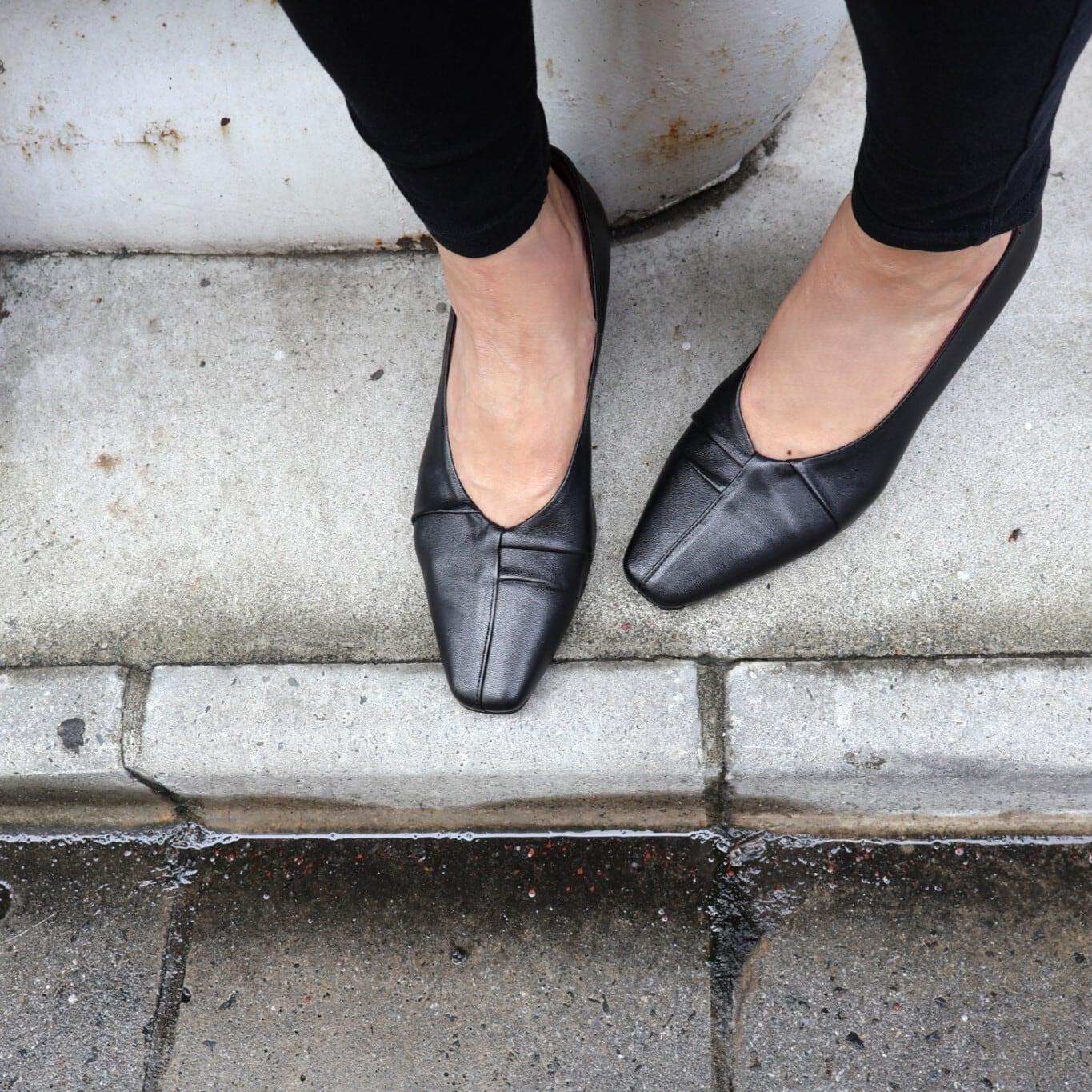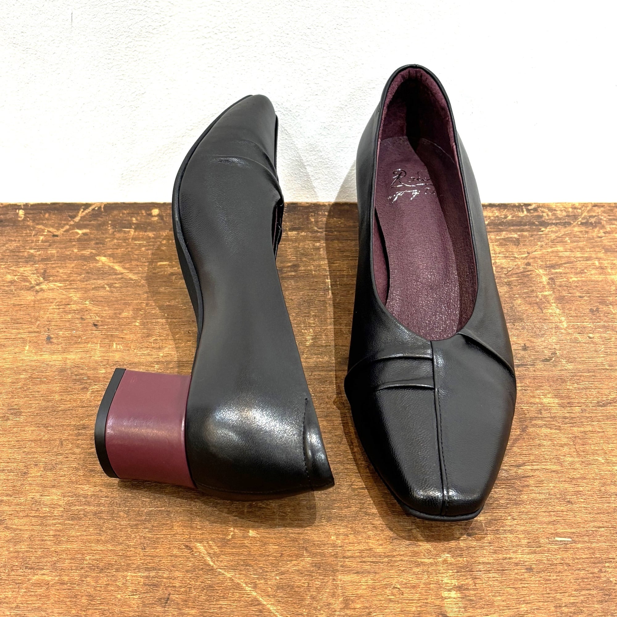スッキリしたスクエアートゥのドレープパンプス。やや深いカットラインは甲を綺麗に見せながら、足押さえも◎なカットに。