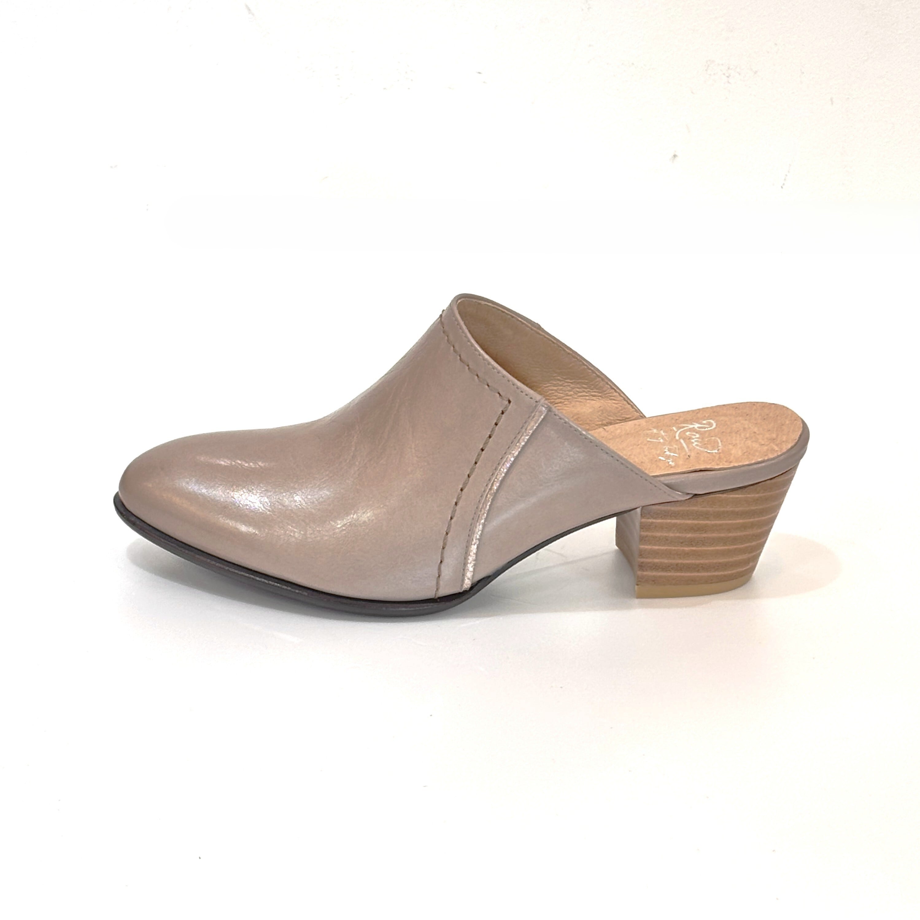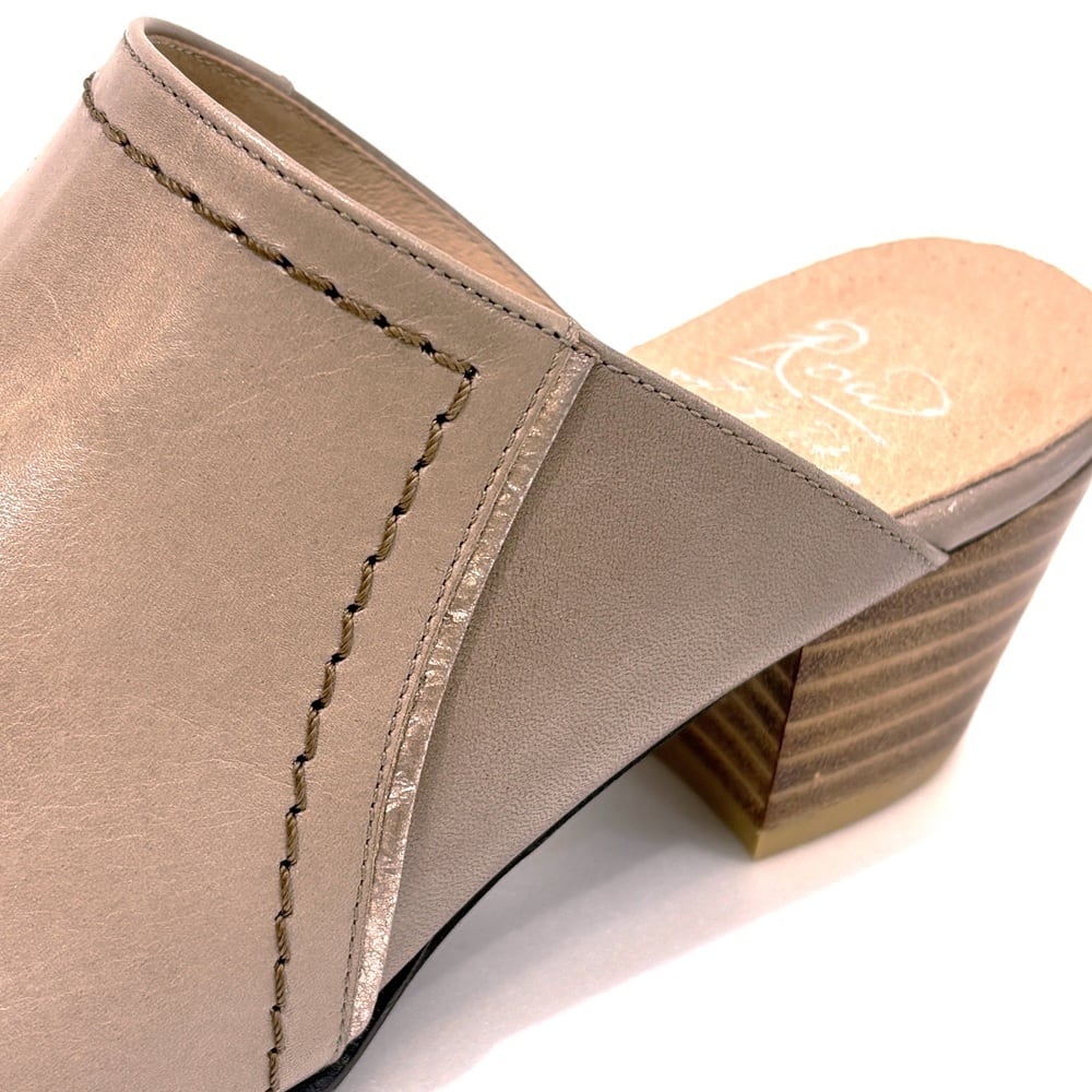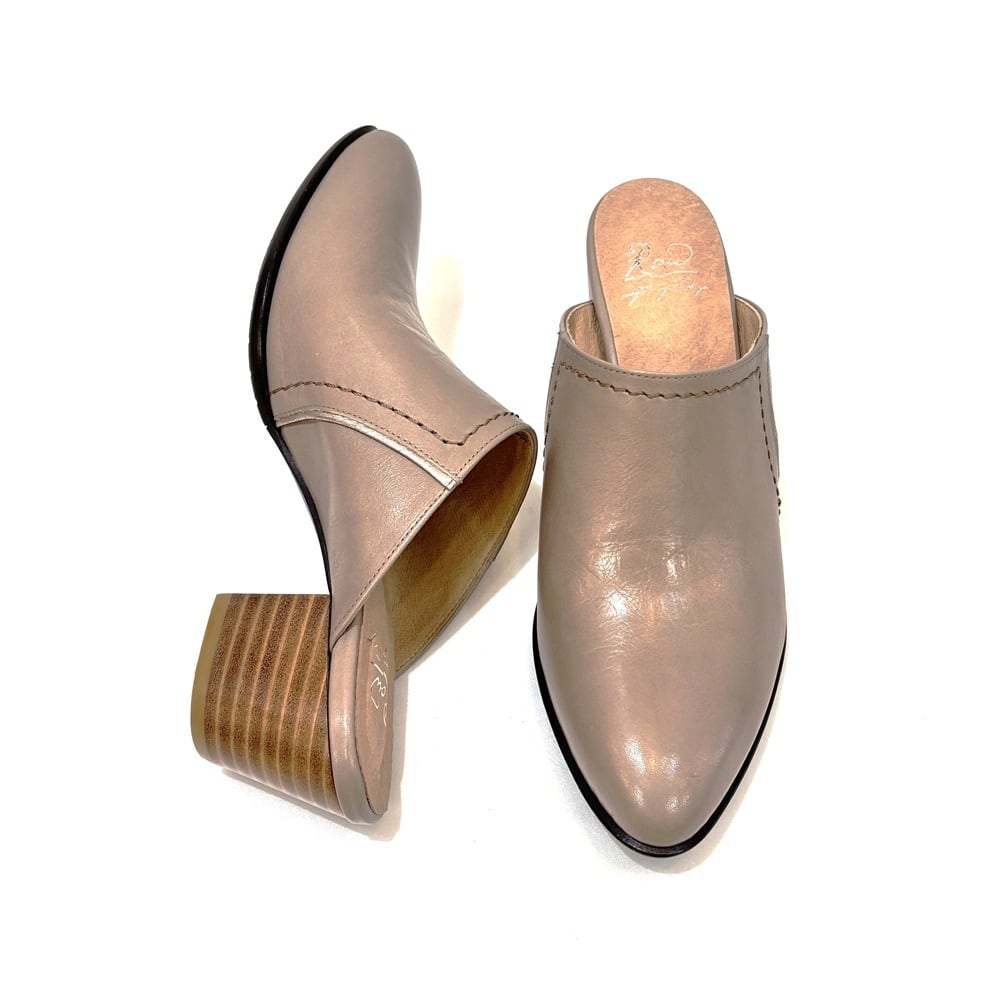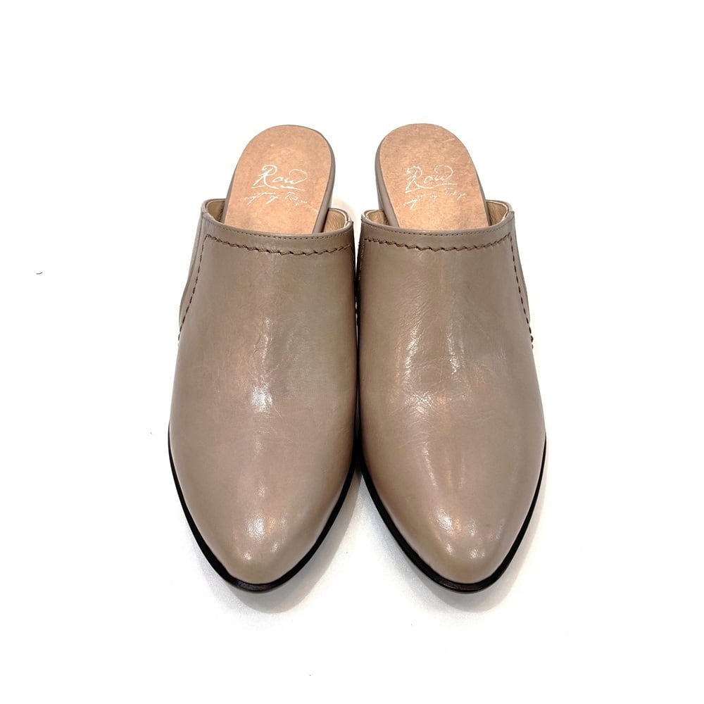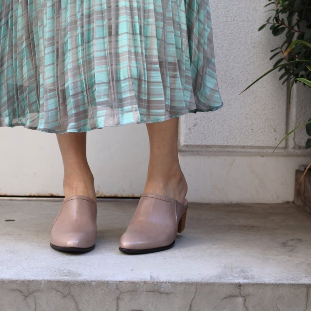 アーチカーブのフィット感とチャンキーヒールで安定感のある木型で作った甲深ミュール。ブーティー感覚の深さは甲の押さえが良く、履きやすく脱げにくいのも◎