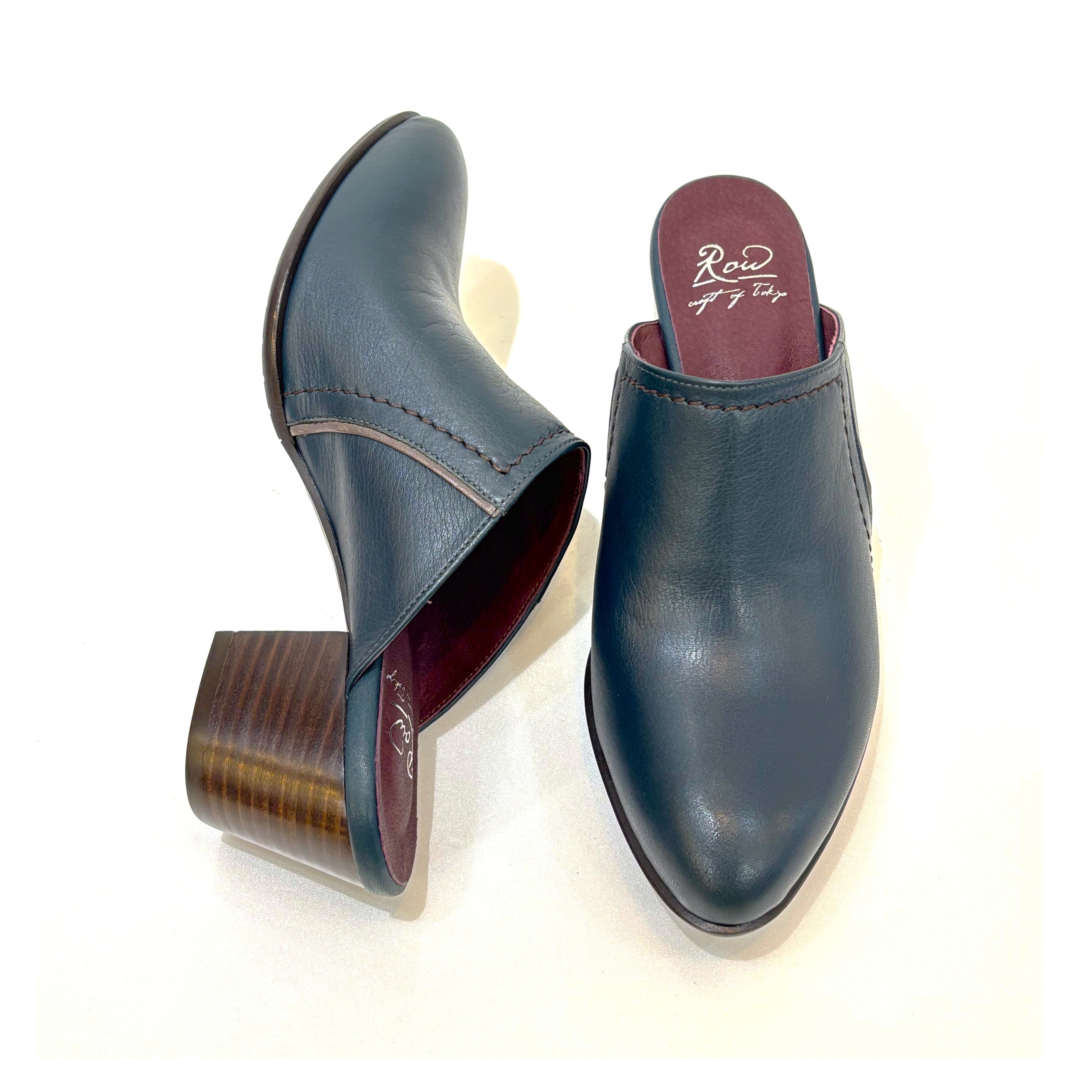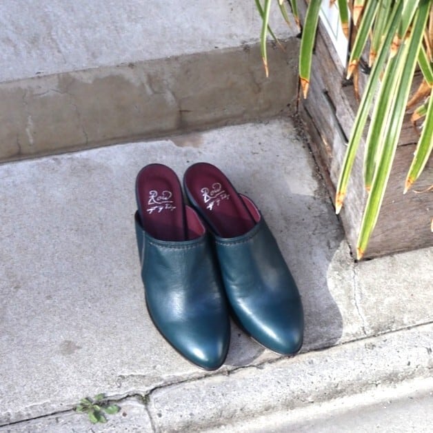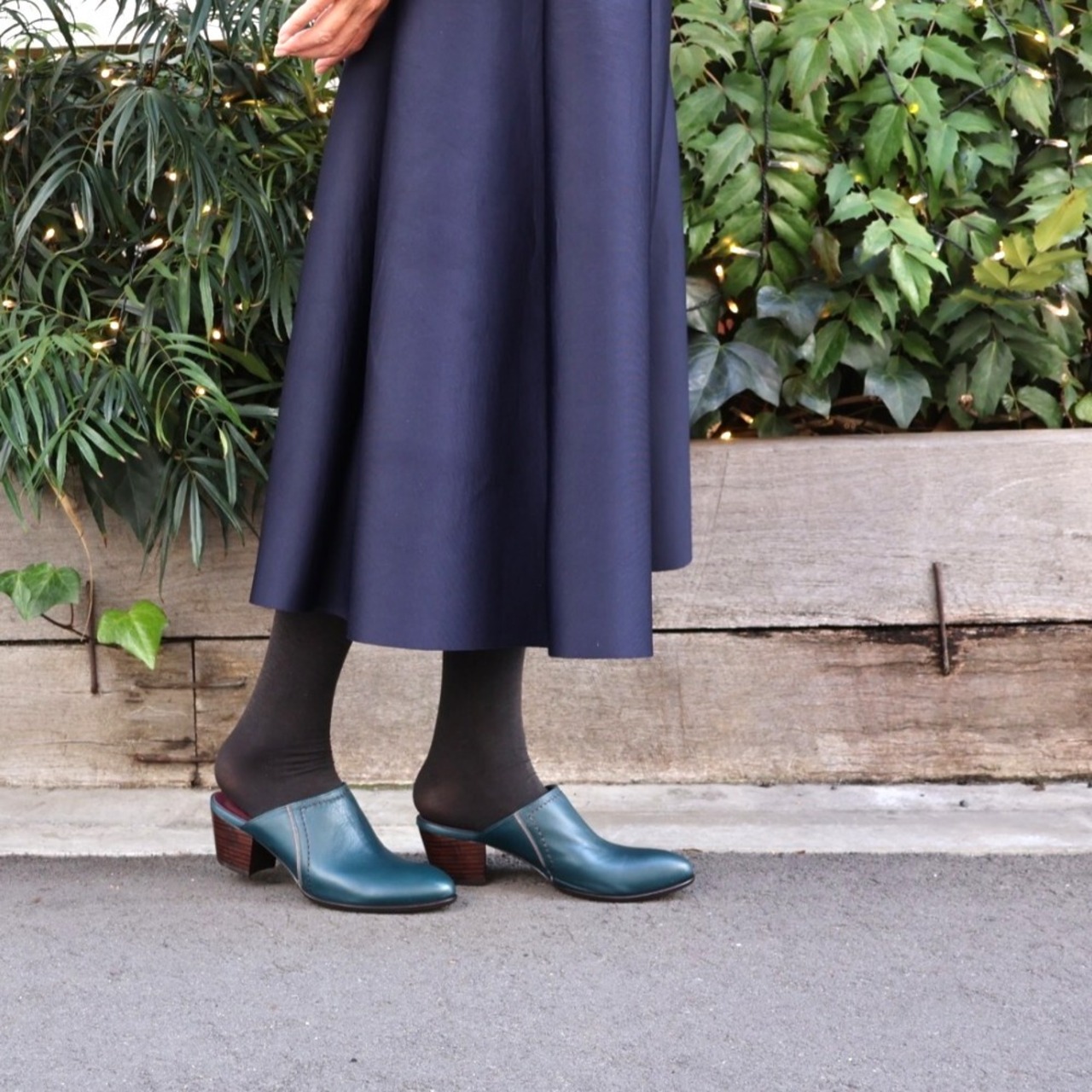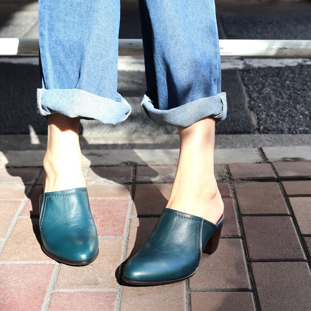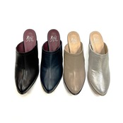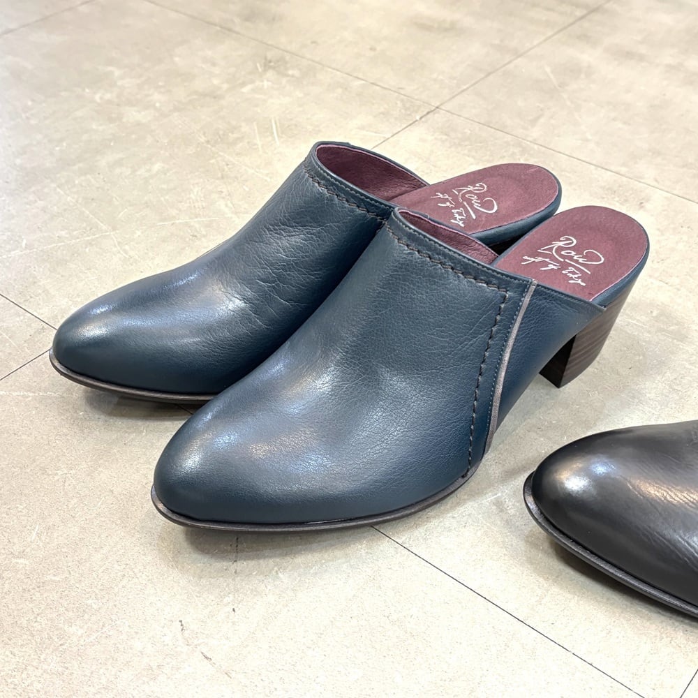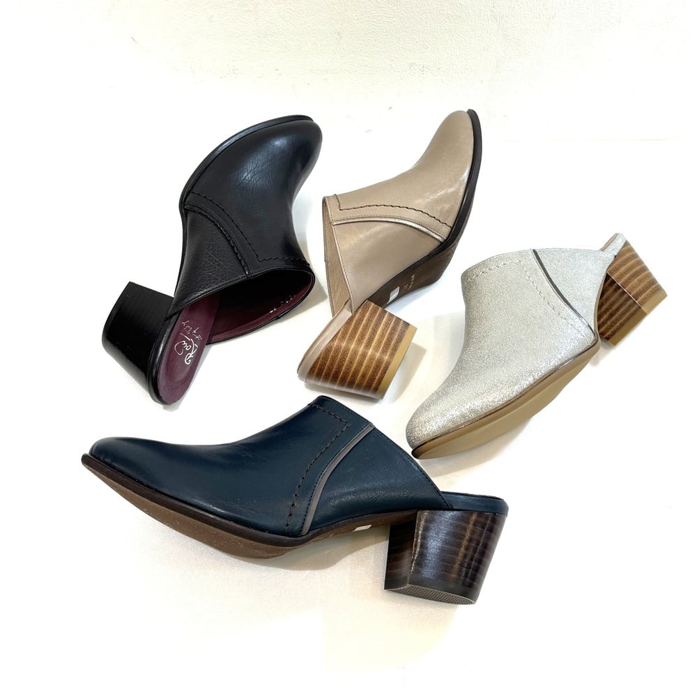 アーチカーブのフィット感とチャンキーヒールで安定感のある木型で作った甲深ミュール。ブーティー感覚の深さは甲の押さえが良く、履きやすく脱げにくいのも◎