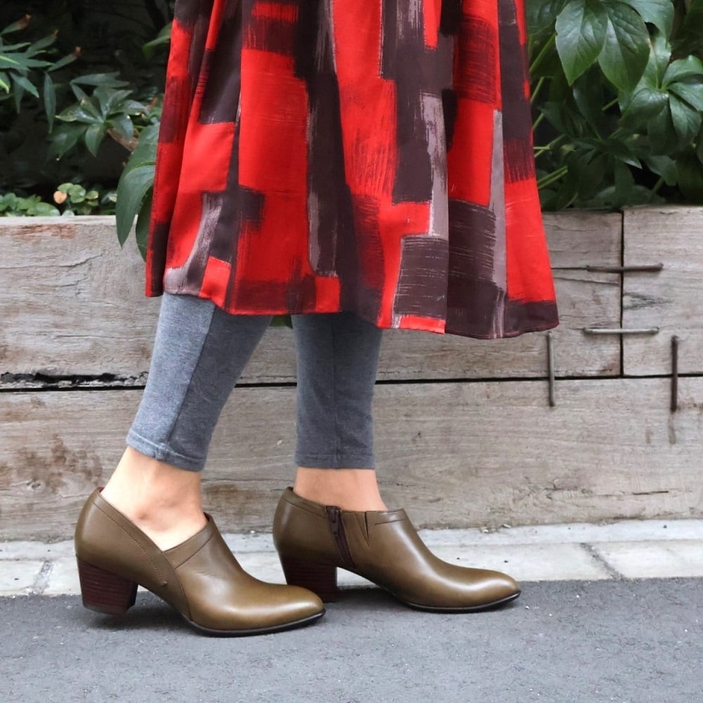 丸みが優しいアーモンドトゥ×5㎝の安定感のあるチャンキーヒールブーティー。しっかりと足を包み込みながら、外側のくるぶしラインのアシンメトリーカットですっきり綺麗な脚見えに♪内側ファスナー付きで着脱も楽々です。
