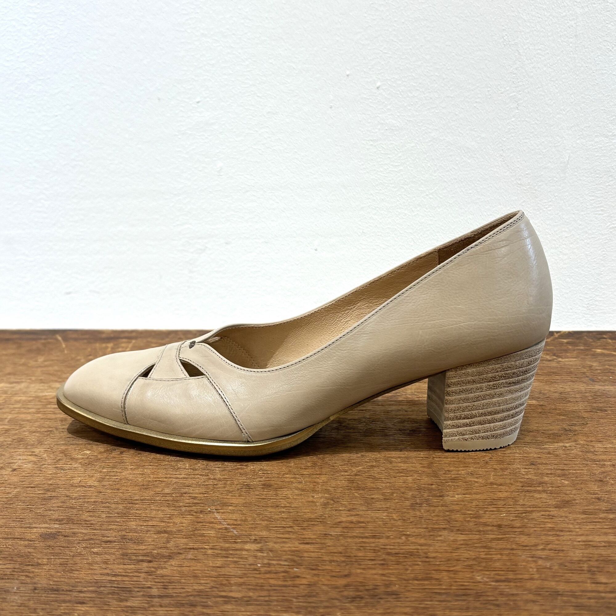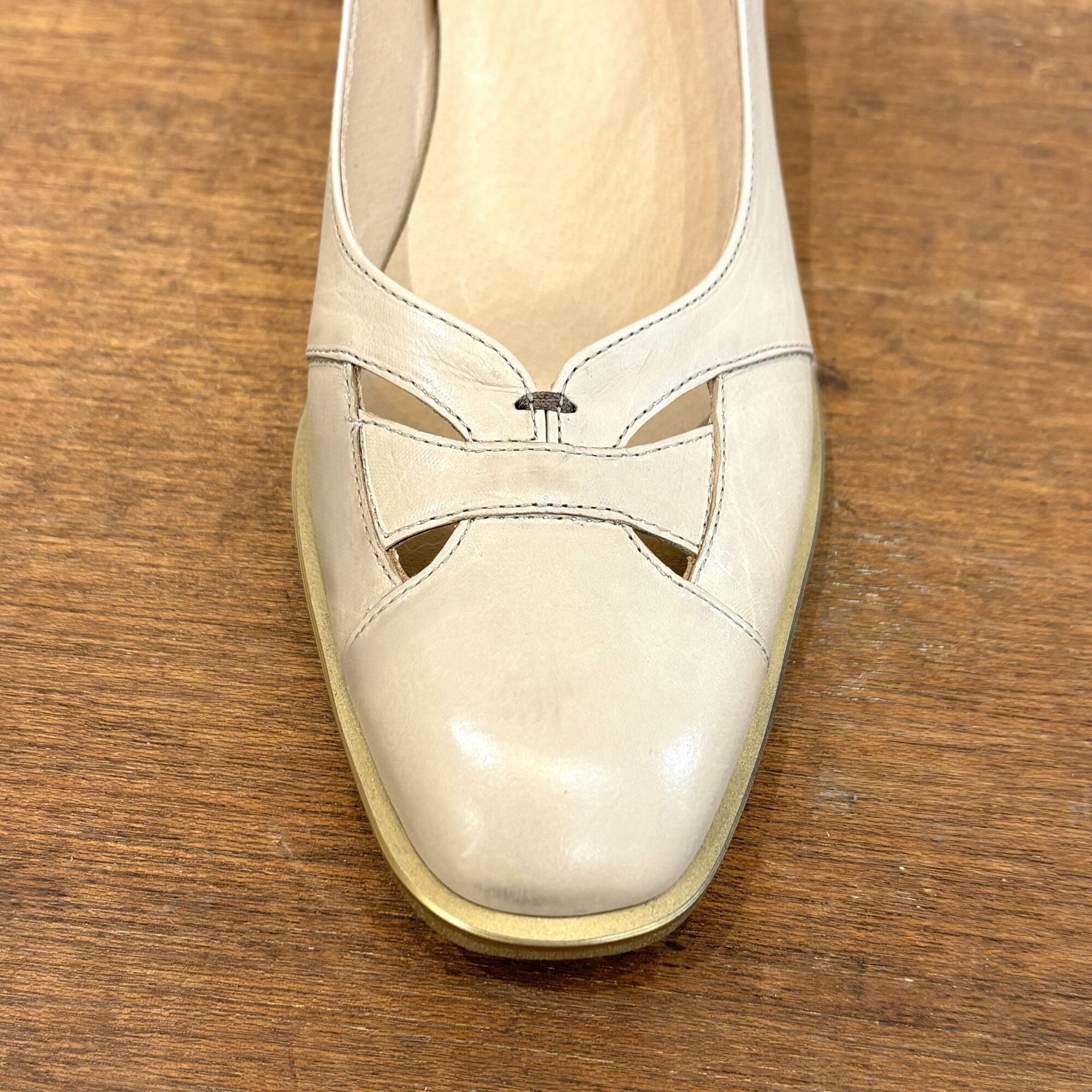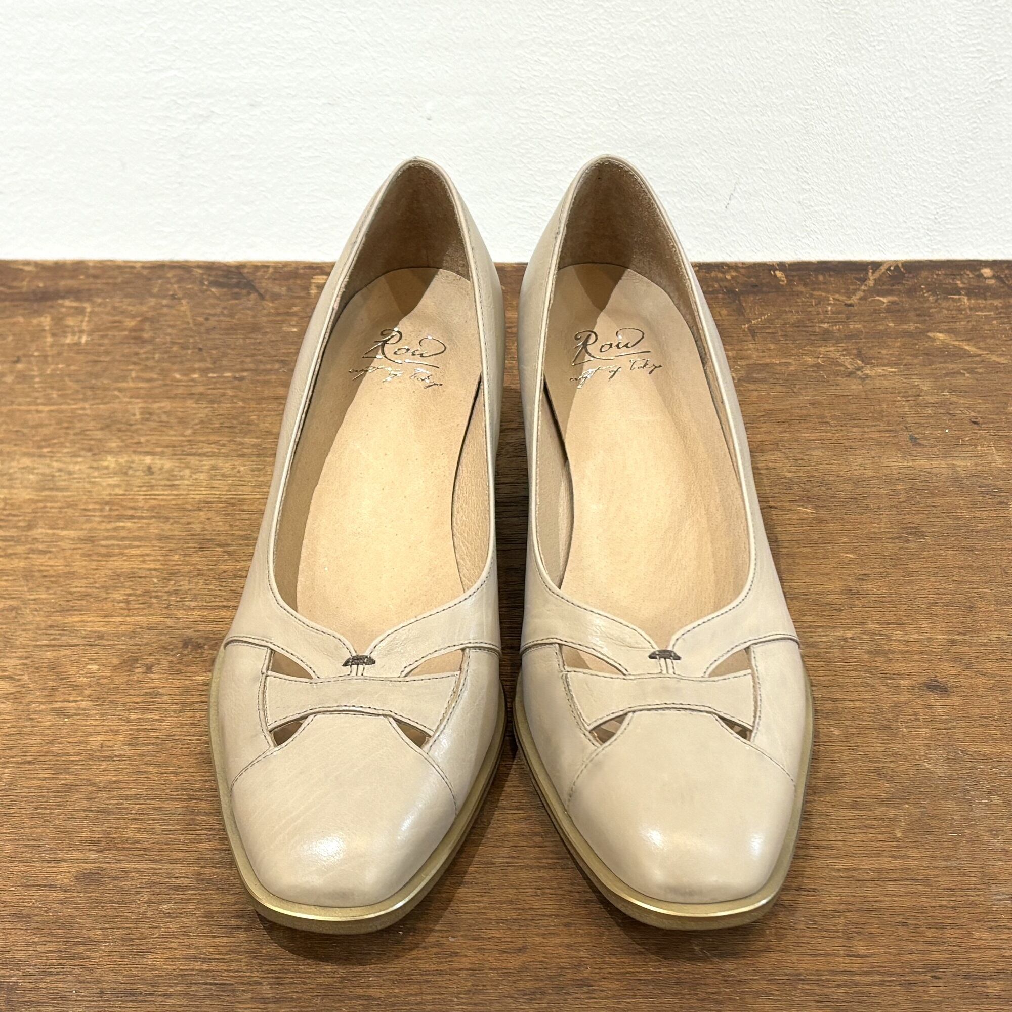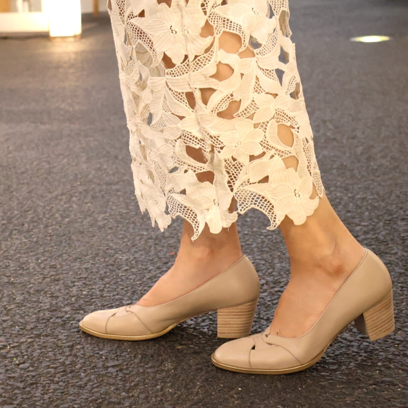 伸びのあるスクエアな木型で仕上げた、抜け感のデザインパンプス。綺麗な女性らしい足元にこだわってます。素足でもカラータイツでも映えるデザイン!